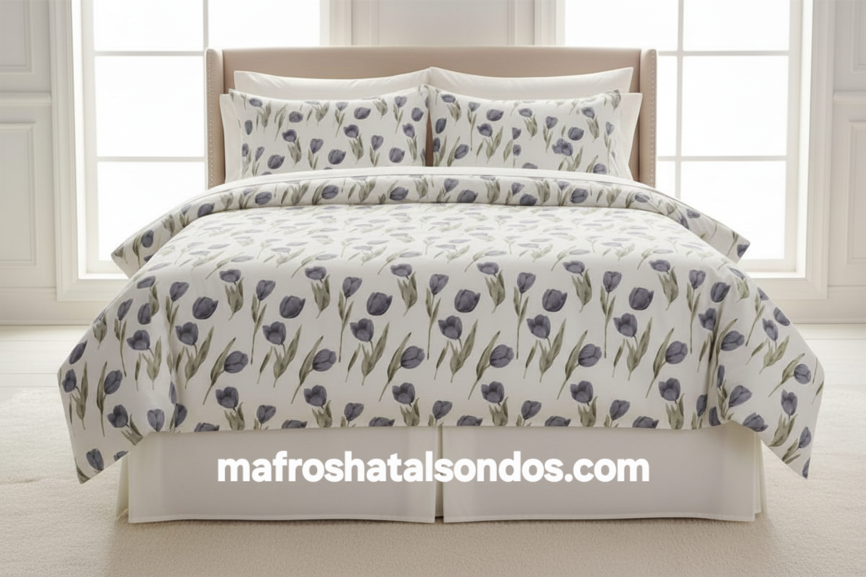 امنحي غرفة نومك لمسة من الرقي والجمال مع طقم الملاية الفاخر بتصميم الزهور البنفسجية الساحرة. تصميم راقي وهادئ يضيف طابعاً من الأنوثة والأناقة لغرفتك.